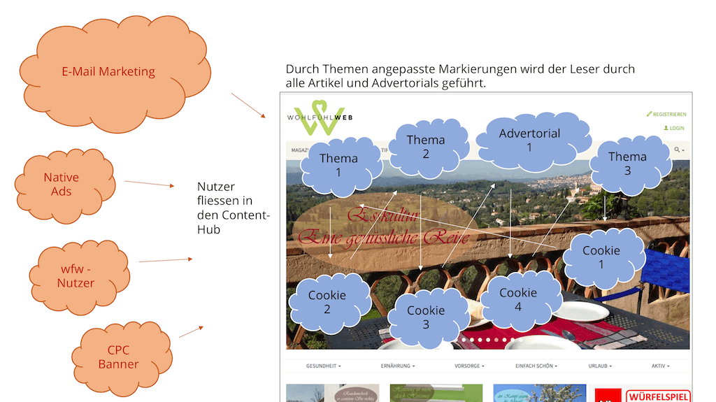 E-Mail Marketing bringt Interessenten auf einen Content Hub im wohlfühlweb. Über die auf dem Hub befindlichen Kontextartikel werden Problemstellungen glaubhaft und tiefgehend thematisiert. Sie liefern Lösungsvorschläge und andere hilfreiche Ratschläge in verwandten Themengebieten und erhöhen die Glaubhaftigkeit und Sympathie. Der Nutzer taucht in seine Thematik ein. Durch eine ausgefeilte Pixelsystematik sorgen wir für ein immer weiteres Eindringen in die zu Ihrem Produkt passenden Artikel und Advertorialsammlung.