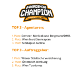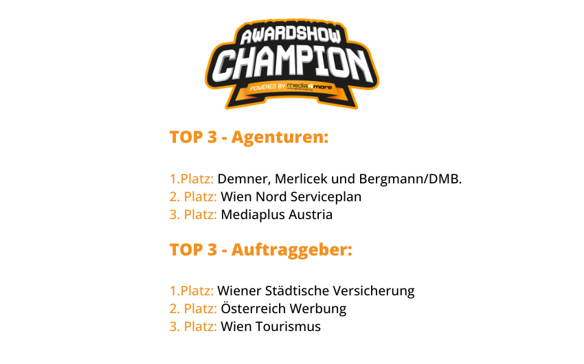 Die auf Platz 1 bei den Awardshow Champion of the year Awards in der Kategorie Agenturen platzierte Agentur Demner, Merlicek und Bergmann/DMB. ergatterte exakt 1.317 Punkte. DMB konnte sowohl bei internationalen Award Shows wie etwa den am höchsten eingestuften Cannes Lions, als auch bei nationalen Top-Awards wie webAD und CCA Venus punkten. Besonders erfolgreich war die Full-Service-Werbeagentur beim Punktesammeln mit Kampagnen für die Wiener Städtische Versicherung (Kampagne „RosaLilaLand“), XXXLutz (Kampagne „Nationalratswahl 2024“) und die NGO Letzte Generation Österreich (Kampagne „Sights of tomorrow“). Auf den Plätzen zwei und drei in der Agentur-Wertung landen Wien Nord Serviceplan mit 542 Punkten bzw. Mediaplus Austria mit 513 Zählern.